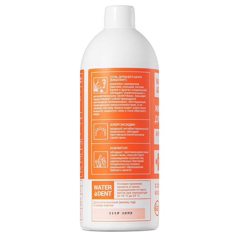 Состав: Вода, ксилитол, ПЭГ-40 (гидрогенизированное касторовое масло), бишофит (хлорид магния, сульфат кальция, хлорид кальция, хлорид натрия и пр.), бетаин, ароматизатор, диглюконат хлоргексидина, сахаринат натрия.