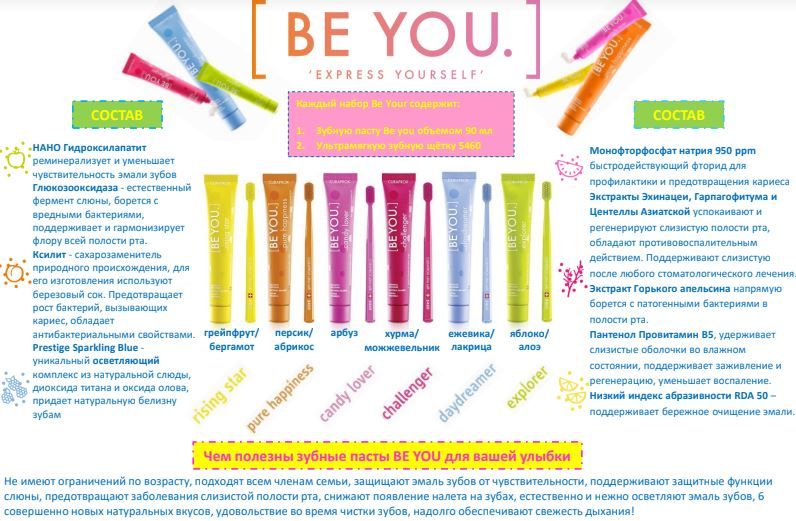 Состав пасты: Вода, глицерин, гидратированный кремнезем, сорбитол, ксилитол, пантенол (провитамин B5), ароматизатор (натурального происхождения), монофторфосфат натрия, ксантановая камедь, кокамидопропилбетаин, микрокристаллическая целлюлоза, децил глюкозид, наногидроксиапатит, глюкозооксидаза, маннит, мальтодекстрин, слюда, сукралоза, D-лимонен, лимонная кислота, гидроксид натрия, метабисульфит натрия, карбонат кальция, экстракт L-ментола, экстракт эхинацеи пурпурной, экстракт центеллы азиатской, экстракт горького апельсина, тиоцианат калия, полилизин, цетиловый спирт, диоксид кремния, хлорид калия, оксид олова, экстракт корня гарпагофитума, Cl 73360
