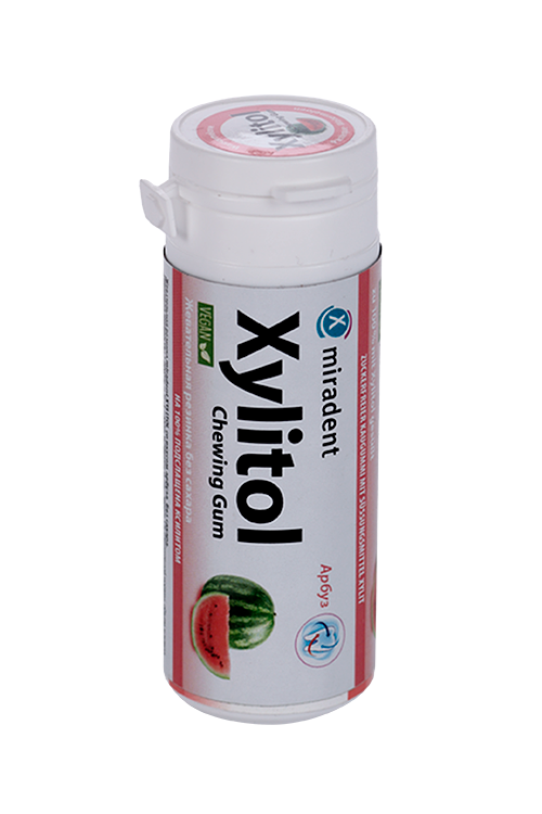 miradent® Xylitol - медицинская жевательная резинка в удобных баночках по 30 подушечек, с фруктовым вкусом. Жевательная резинка с ксилитом имеет очищающее и предотвращающее налёт действие, эффективно блокирует образование кариеса, особенно после еды. Вся серия жевательных резинок Xylitol не содержит ни один из опасных искусственных заменителей сахара. В качестве подсластителя в Xylitol использован натуральный ксилит, получаемый из растительных компонентов и древесины лиственных пород.